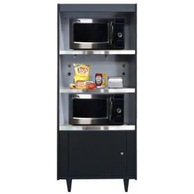 Condiment Stand for up to 3 microwaves. Units feature 20-amp receptacles and can accommodate up to 3 microwaves, or brewer, toaster ovens, etc. Double-wall metal construction. Durable vinyl-clad steel fronts. Stainless steel work shelves. Cabinet mounted, 20 amp receptacles (one per shelf). 12 foot electrical cords. Stain resistant gray interior. Bison Black.