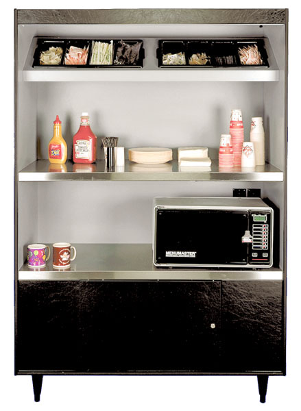 Condiment stand for up to 4 microwaves with Two High Trays. Units feature 20-amp receptacles and can accommodate up to 4 microwaves.