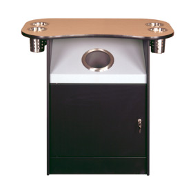 Light oak top with stainless steel condiment cups (4) (condiment tray also available), Includes Trash Chute, Dark red colored cabinet (also available in black), Space for branding or accent name, All metal heavy gauge steel construction, Wash & wipe, stain & scratch resistant top, Metal door and non-sag custom hinge