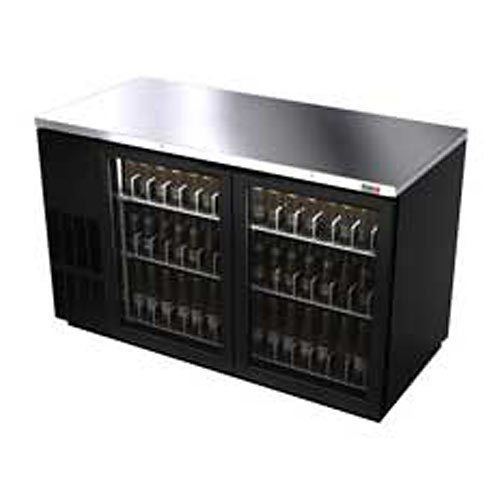 Backbar Cooler, (2) glass doors with black frame, (852) 12 oz cans or (2) keg capacity, (4) epoxy coated flat shelves, (2) epoxy coated bottle rails, 18 ga. s/s top, black exterior finish, galvanized interior, s/s floor, doors w/locks, fluorescent interior light, self-contained refrigeration, 1/3 hp, cETL, UL, NSF-7