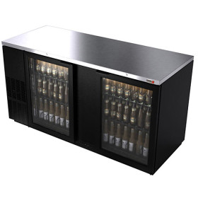 Backbar Cooler, (2) glass doors with black frame, (1014) 12 oz cans or (3) keg capacity, (4) epoxy coated flat shelves, (2) epoxy coated bottle rails, 18 ga. s/s top, black exterior finish, galvanized interior, s/s floor, doors w/locks, fluorescent interior light, self-contained refrigeration, 1/3 hp, cETL, UL, NSF-7