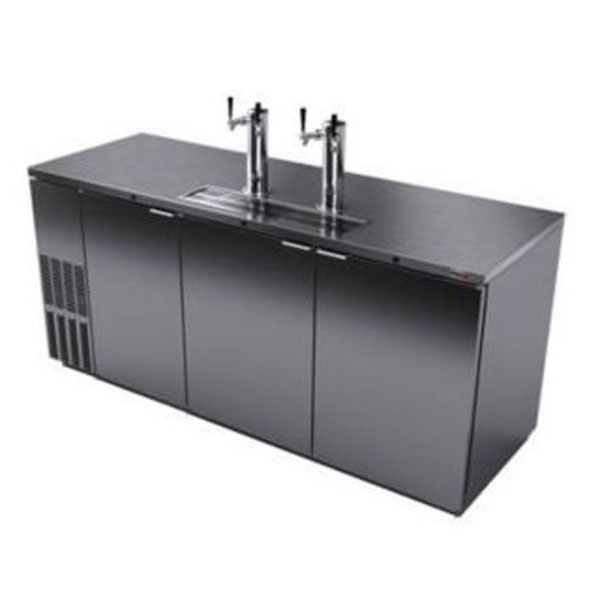 Draft Beer Cooler, 3 section, (4) keg capacity, stainless steel front, sides and top, galvanized back, s/s floor with removable polymer protection, analog thermostat, (2) tower, (4) tap, (3) doors w/locks, fluorescent interior light, self-contained refrigeration, includes (1) 4 way gas valve, 1/3 hp, cETL, UL, NSF-7, Made in North America