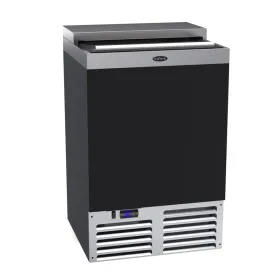The sleek black exterior of the Krowne BC24-BG forced-air bottle cooler is attractive for front-of-house operation. If a customer orders a beer, the bartender can access it quickly and efficiently through the sliding lid. It has two inches of insulation to assure bar staff that beverages will be cold every time. To expedite cleaning, the interior is made of stainless steel, which is simple to wipe down.