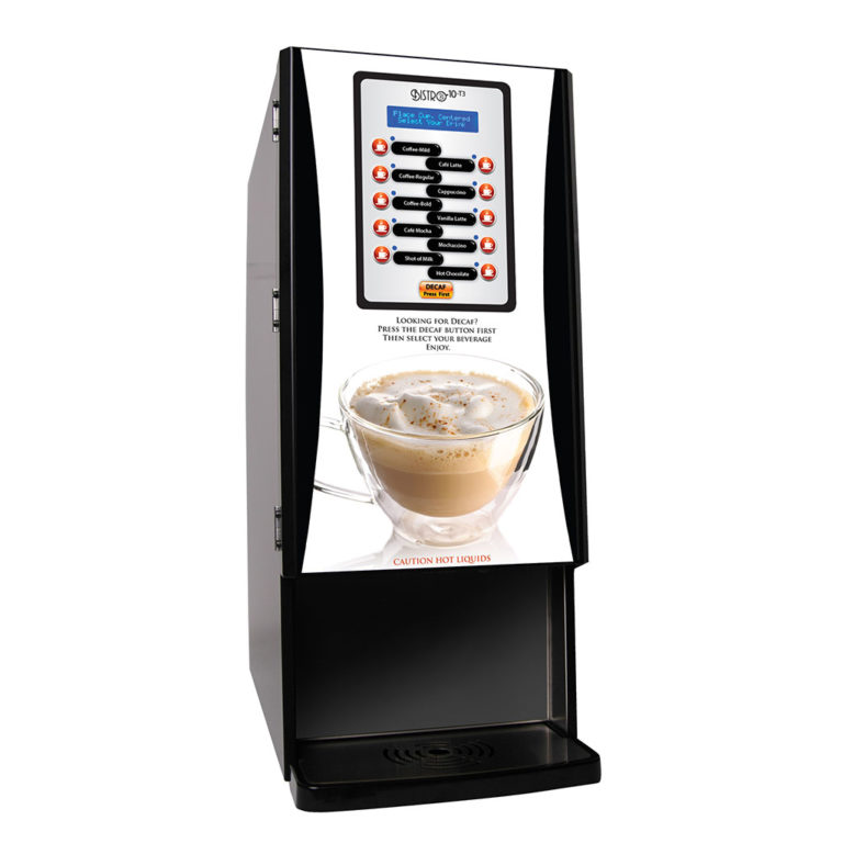 The Bistro 10-T3 (Hot only) dispensing systems makes all of your favorite hot specialty coffee drinks in less than 15 seconds. Take advantage of 100% coffee on-demand without the fuss of brewing or wasted coffee. Specialty drinks are always freshly prepared and at the press of a button. Choose from lattes, cappuccinos, cafe mocha, and more. The system is designed to use coffee concentrate for dispensing coffee drinks, Soluble cocoa & powdered dehydrated milk and other flavors for drink creations.
