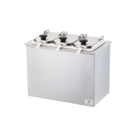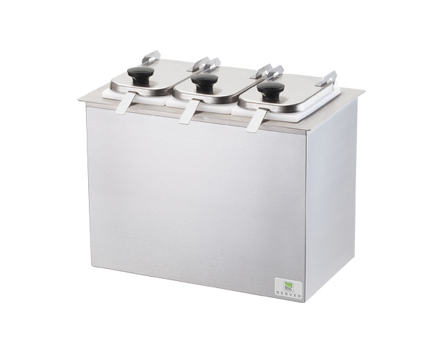 This insulated bar combo includes (3) shallow plastic jars 82558, stainless steel hinged lids 82545 and 1 oz (30 mL) ladles 82562. The brushed finish base reduces the visibility of fingerprints and may be cooled with (2) Eutectic Ice Packs or ice. Ice packs are sold separately. When you place your order, be sure to request colored knobs engraved with your contents for a clean presentation. Black knobs are standard.