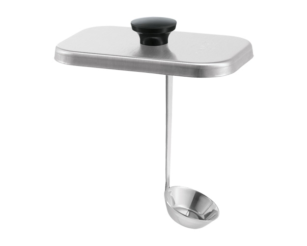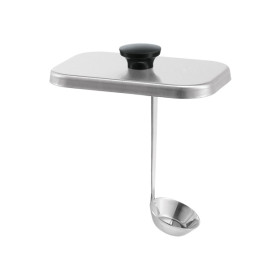 Speed prep time with a lid and ladle combination for your fountain jar based topping station. Ladle portions are 1 oz (30 mL) by volume. The stainless steel lift off lid with attached ladle fits a shallow plastic fountain jar.