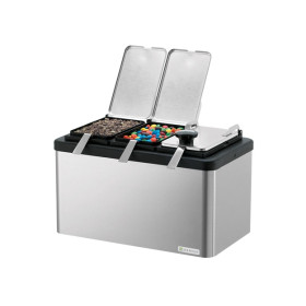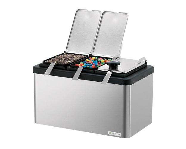 This insulated bar combo includes (3) 1/9-size plastic jars, 6" (15.2 cm) deep with stainless steel hinged lids 87229 and 1 oz (30 mL) ladles 87213. The brushed finish base reduces the visibility of fingerprints and may be cooled with (2) Eutectic Ice Pack 94013 or ice. Ice pack is sold separately. When you place your order, be sure to request colored knobs engraved with your contents for a clean presentation. Black knobs are standard.