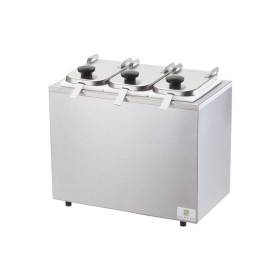 This insulated bar combo includes (3) shallow plastic jars 82558, stainless steel hinged lids 82545 and 1 oz (30 mL) ladles 82562. The brushed finish base reduces the visibility of fingerprints and may be cooled with (2) Eutectic Ice Packs or ice. Ice packs are sold separately. When you place your order, be sure to request colored knobs engraved with your contents for a clean presentation. Black knobs are standard.