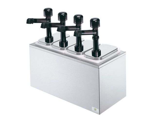 Keep your countertop clean and convenient with a serving bar. The SB-4 includes four polycarbonate Solution™ condiment pumps (81910) and four deep plastic fountain jars (82557). The stainless steel bar has a brushed finish to reduce the visibility of fingerprints. Insulated Serving Bars may be cooled with one Eutectic Ice Pack per jar, HOLDCOLD™ Jars or ice.